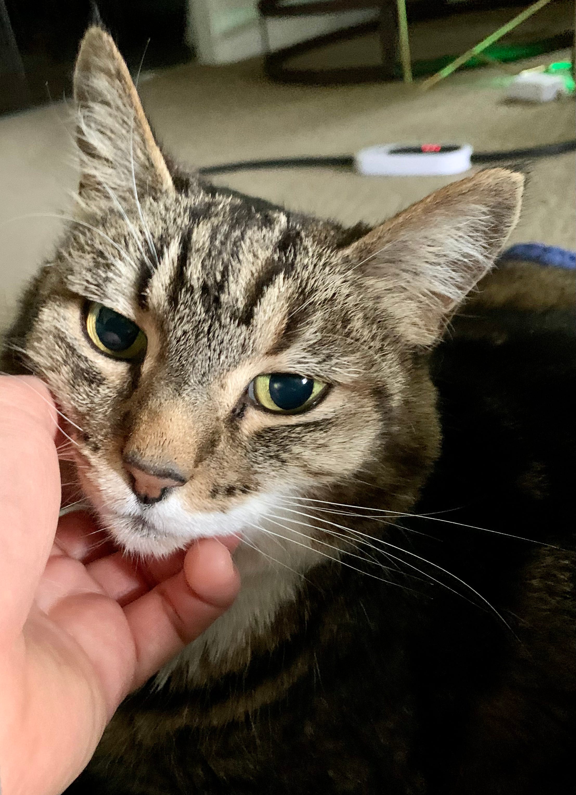 This could also be never too sick to play. What does it even mean to you to “play”? We have our different ideas in our minds of what that might look like or what qualifies as play, but this can also just be a way of being in the world. Georgie was totally game to play with her ribbon toy, or to just play a altered version of hot hands, or hot patas in her case. Even just her way of being curious brought in elements of play despite her being an old, very sick kitty. She was not some spry, young kitten, but definitely kept the spirit of one.